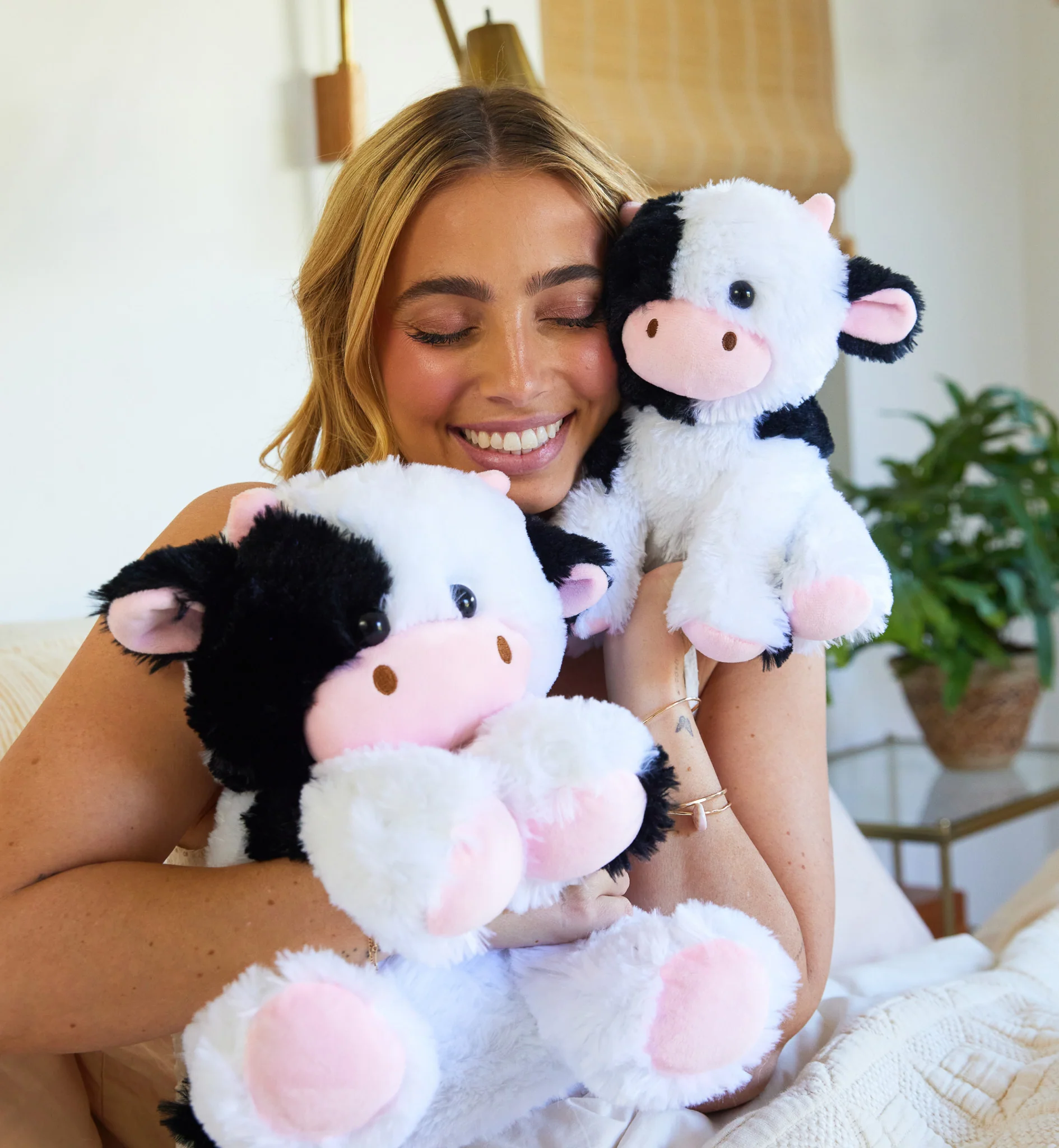 Meet Mini Milkshake the Cow! Mini Milkshake brings the same playful, sweet comfort in a more portable, 2-pound package. This smaller version of our original Milkshake is just as loving and heartwarming, offering a cozy, flexible hug wherever you go. Whether you're looking for a little comfort on the move or need a sweet companion to unwind with, Mini Milkshake is the perfect friend.