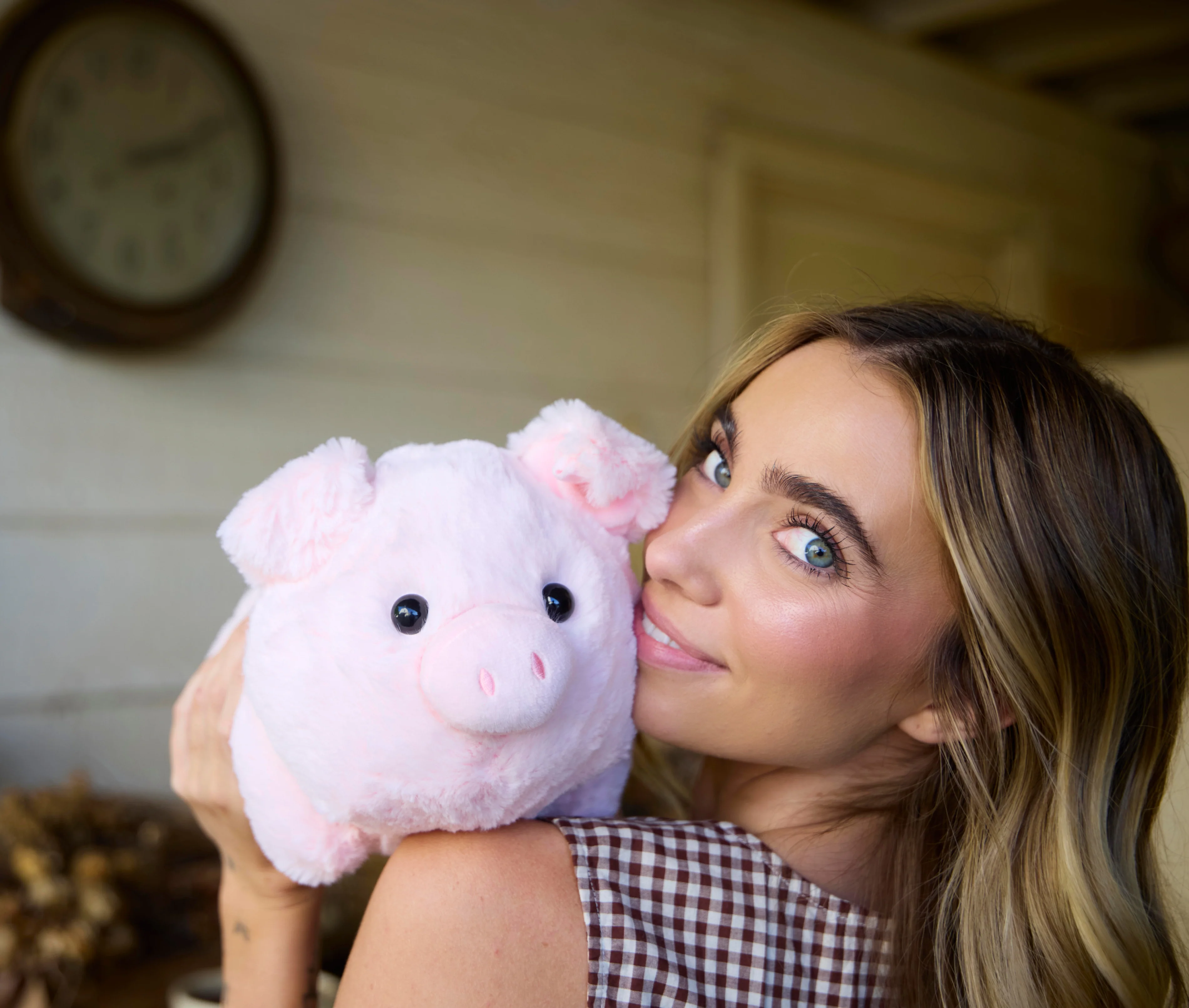 Snuggle up with Peach the Pig—your perfect cuddle companion! When life gets a little too heavy, Peach is here to help you slow down and breathe easy. With her plush pink fur and soft weighted belly, she will help bring a little peace, a lot of softness, and just the right amount of piggy love.